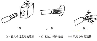 ①在线芯直径与孔大小较匹配时,在一般用电场所,把线芯进一步绞紧后装入孔中即可,如图(a)所示。若在用电危险场所,为了防止线头可能从孔中脱出,应作如下处理:线头绝缘层应剥去多一些,在进一步将线芯绞紧前,线芯端头分三级剪去多余部分。以7股线为例,宜2股剪得最短;4股稍长,长出单股线芯直径的4倍;另1股最长,长得应能在4股稍长线芯上紧缠两圈的需要量,待多股线芯作进一步绞紧后,把这股最长线芯紧缠在端头上。这样,能使线头的线芯端头略大些,在压紧螺钉松动时,即使导线稍受外力牵拉,也不易脱出孔。
