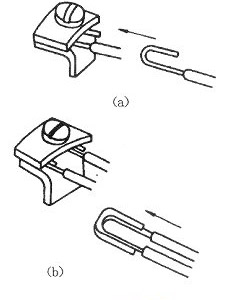 这种接线端子传统的压紧方法与7股导线压接圈的弯法类似,只是垫圈采用瓦形(或叫桥形)构造。为了防止线头脱落,在连接时应将线芯作如下图(a)所示的方法进行工艺处理。如果需把两个线头接入同一个接线端子时,应按下图(b)所示的方法进行连接。