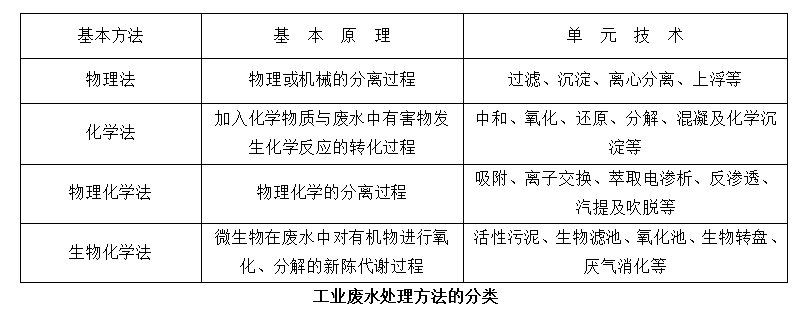 把废水处理大体分类,可分为除去悬浮固体物质的、除去胶态物质的和除去溶解物质的三种。在方法上有物理方法、化学方法、物理化学方法和生物学方法,如下表所示。